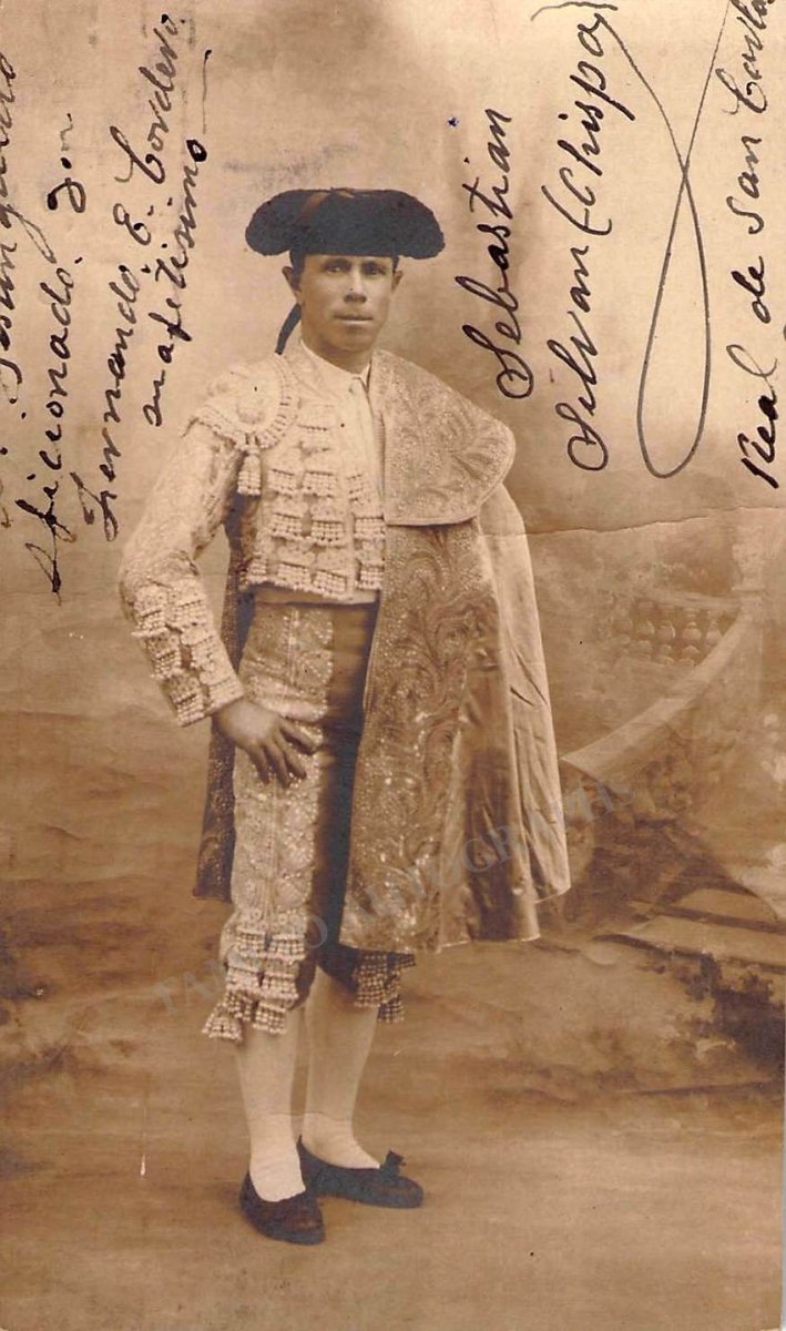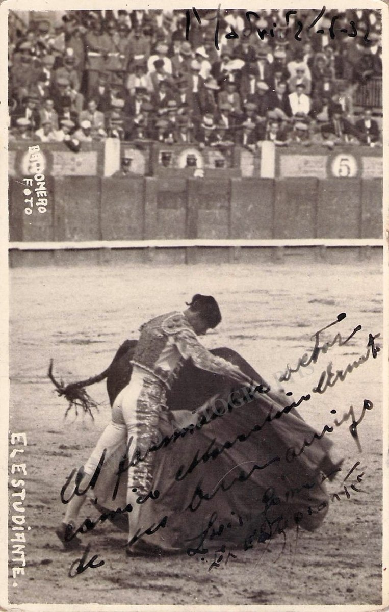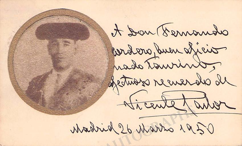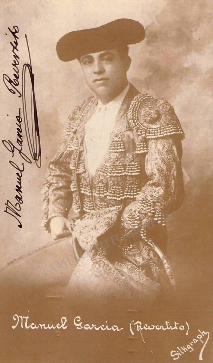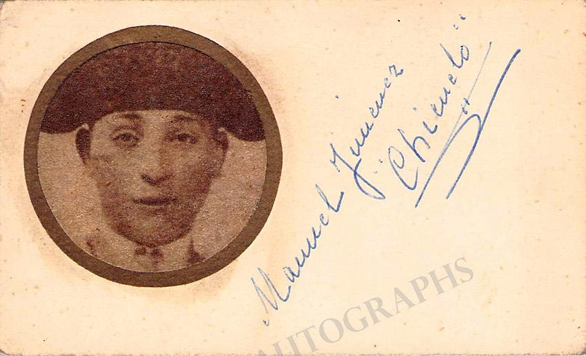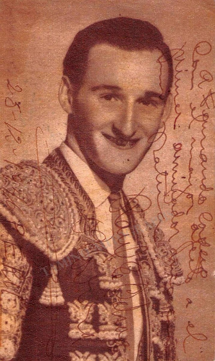Rare collection of 21 autograph photos and cards, each signed by a famous Spanish bullfighter. Full list includes: Angel Carmona ("El Carnicero" or "The Butcher"), Antonio Bienvenida, Antonio Fuentes, Antonio Marquez, Juan Bienvenida, Luis Gomez Calleja, Luis Miguel Dominguin, Luis Suarez ("Magritas"), Manuel Garcia ("Revertito"), Manuel Gonzalez, Manuel Jimenez ("Chicuelo"), Manuel Mejias, Manuel Torres ("Bombita"), Marcial Lalanda, Martin Francisco Caro ("Curro Caro"), Rafael Gonzalez Madrid ("Machaquito"), Raul Ochoa Rovira, Ricardo Torres Reina, Sebastián Silvan ("El Chispa"), Vicente Pastor and Gregorio Tebar ("El Inclusero"). Varios sizes, with most being postcard size, cards are 4.5 x 2.6 inches, all in very good condition. A rare, quite unique set!