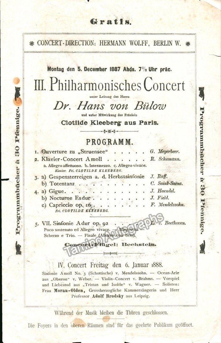Hans von Bulow conducts Berlin Philharmonic Orchestra, December 5th, 1887. Clotilde Kleeberg, piano. Program page of Hans von Bülow in his first season as chief conductor of the Berlin Philharmonic. Soloist Clotilde Kleeberg, one of the greatest female pianists of the 19th century. Meyerbeer, Schumann piano concerto, Beethoven symphony n° 7, Raff, Saint Saens, Haendel, Field, Mendelssohn. With announcement and detailed program of following concert with Bulow and violinist Adolph Brodsky on January 6th, 1888. Mendelssohn, Weber, Brahms violin concerto, Wagner excerpts from Tristan und Isolde. Excellent condition.