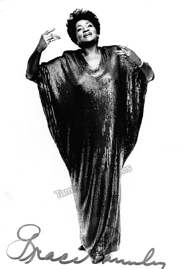 Nice black-and-white photograph signed by her, shown in performing pose. Size is 4.9 x 6.9 inches, some superficial damage over the top border (not affecting image or signature), otherwise in very good condition.