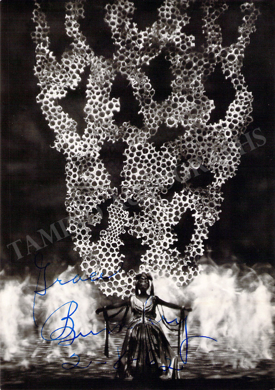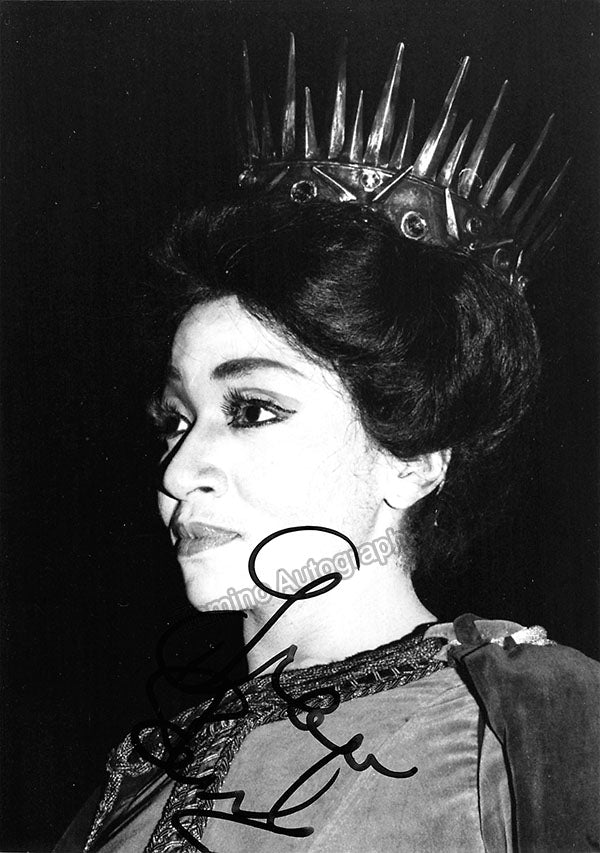 Nice black-and-white photograph signed by her, shown as Lady MacBeth in Verdi's opera MacBeth at Orange, 1978; ink-stamped on verso by Studio Bernateau Antic Photo (Orange). Size is 5 x 7 inches, in excellent condition.