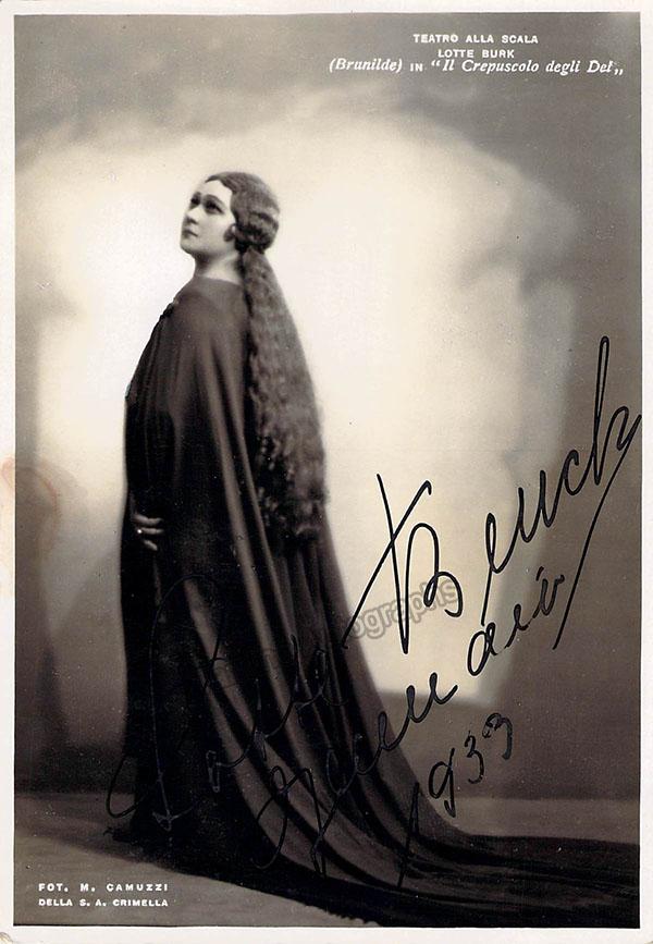 Signed postcard photograph, shown as Brunnhilde in Wagner's Der Ring des Nibelungen (specifically Die Gotterdammerung),dated in 1939. Photograph by M. Camuzzi, La Scala, Milan. Size is 4 x 5.75 inches, in excellent condition.