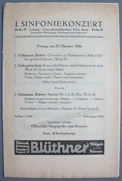 Issay Dobrowen, piano and Fritz Busch. Staatskapelle Dresden, October 22nd, 1926. Volkmann: Ouverture "Richard III". Dobrowen: Piano concerto. Schumann: Sinfonie Nr. 1 . Covers are missing, rest is complete and in excellent condition