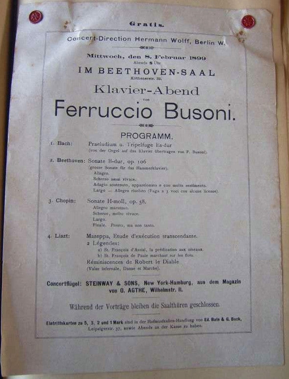 Berlin - February 8th, 1899. Bach/Busoni : Praeludium und Tripelfuge Es-dur Beethoven : Sonate B-dur, op. 106 Chopin : Sonate H-moll, op. 58 Liszt : Mazeppa, Etude d´execution transcendante, 2 Legendes, Reminiscences de Robert le Diable, 25 x 18 cm, 1 page, excellent condition, carefully attached to a large blank page .