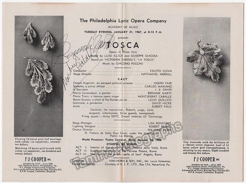 Program for a performance of Puccini's Tosca at the Philadelphia Lyric Opera on January 31st, 1967, signed by the star Spanish soprano and the Spanish tenor on the cast page.  Size is 6 x 9 inches, full program with all pages and covers, in very good condition.