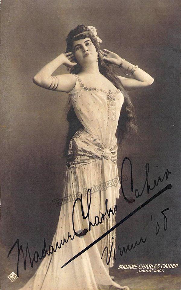 American mezzo-soprano (1870-1951), also known as Sara Cahier, signed photo postcard, shown as Dalila in Saint Saen's Samson et Dalila, signed in Vienna, dated in 1905. Photo by Mertens, Vienna. Size is 3.25 x 5.25 inches, in excellent condition!