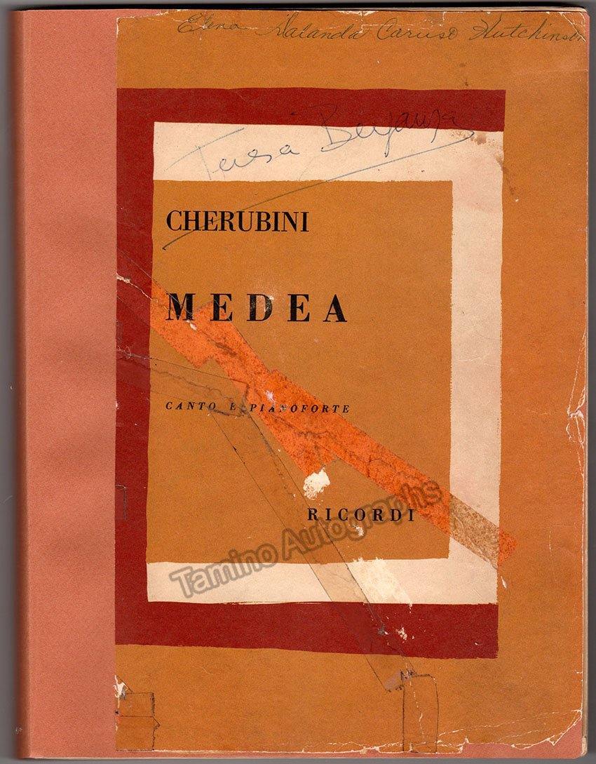 Signers include Maria Callas (this is signed by her husband, who made her signature, and not by her hand), who also wrote "Medea, Dallas 1958" under her signature on the title page of this score, John Vickers, conductor Nicola Rescigno, Teresa Berganza (who signed on the front cover), Jon Vickers, Franco Zeffirelli, and many other signatures we could not identify, probably staff members of the opera house, some of the signatures are dated in 1958.
