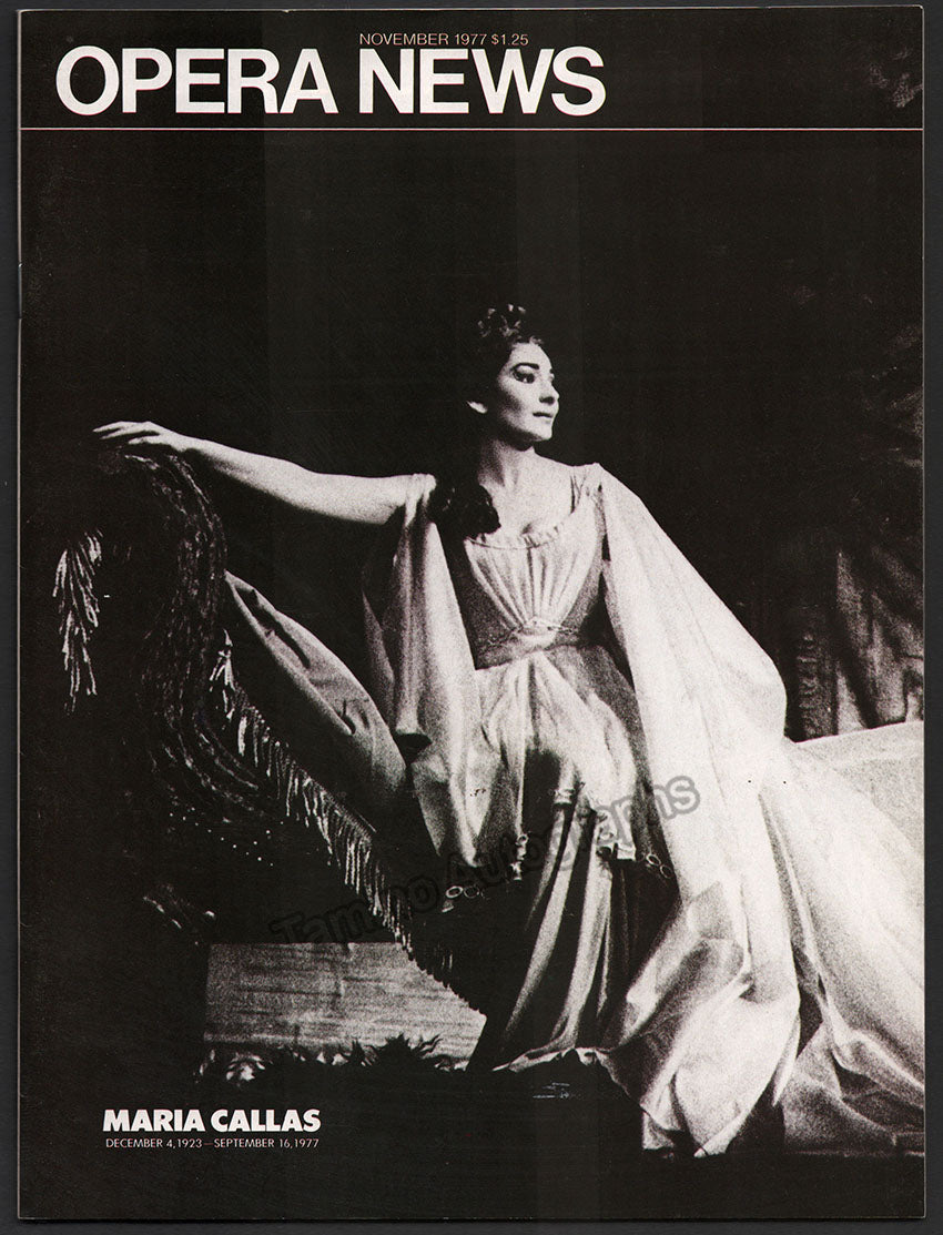 Complete issue of Opera News Magazine from November 1977 with many articles in memory of the Greek-American diva (NOT signed by her) about her life and career, who had recently passed away in September of that same year.  Size is 8.25 x 11 inches, 84 pages plus soft covers, in excellent condition.
