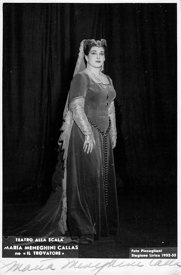 Superstar Greek-American soprano (1923-1977), attractive signed photograph, shown as Leonora in Verdi's Il Trovatore at La Scala, Milan in the 1952-53 season.