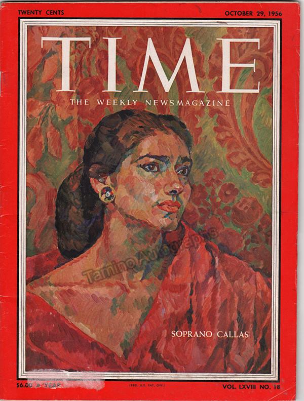 TIME magazine, 1956, celebrating the diva´s debut at the Metropolitan Opera in New York, with article about her. Full magazine with all pages and covers, in very good condition, 8.25 x 11 inches.