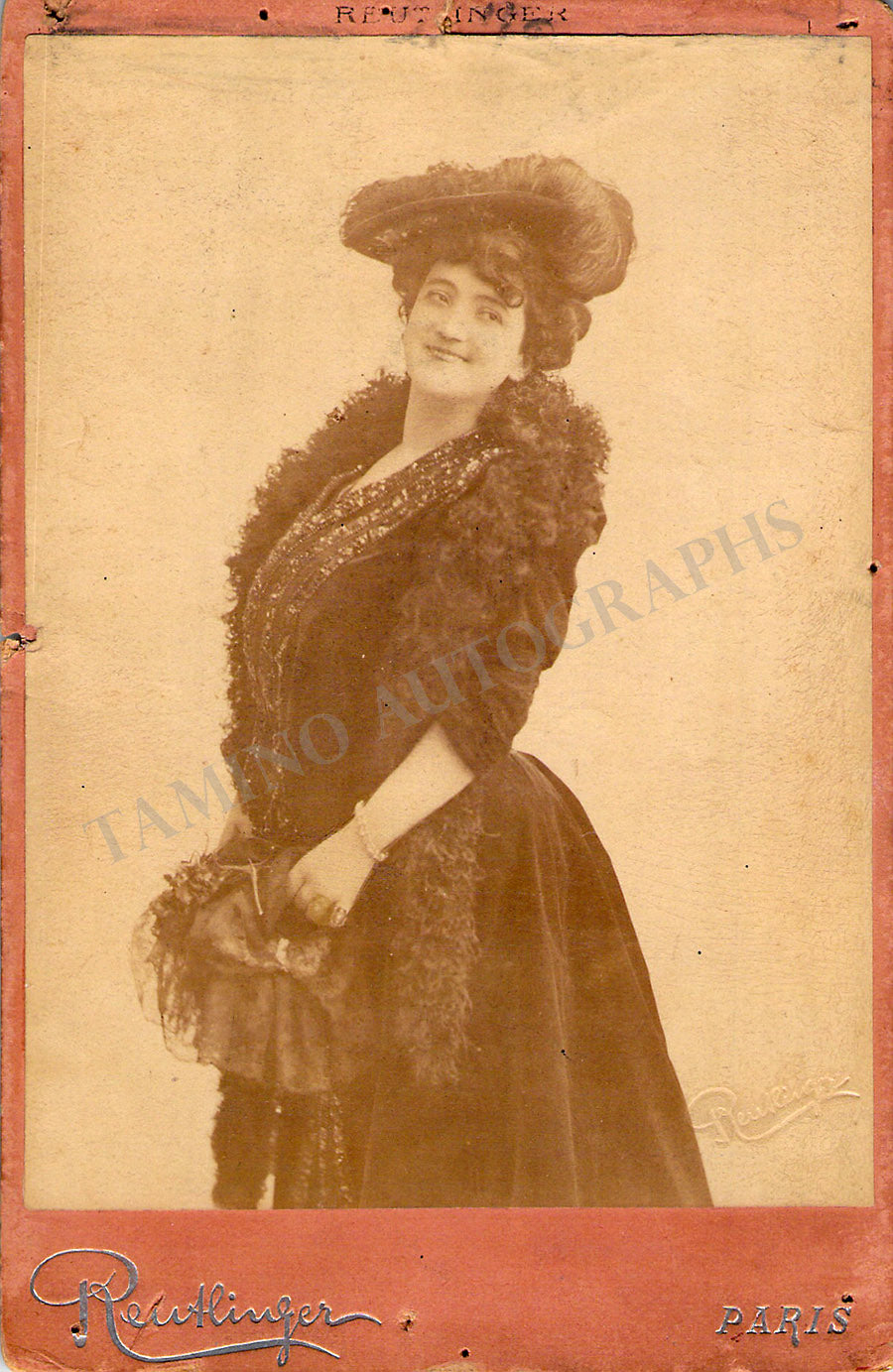 Unsigned cabinet photograph, shown as herself. Photo by Reutlinger, Paris. Size is 4.25 x 6.5 inches, small creases and tears on edges of the photo and bullet holes beneath along with mounting traces on verso, priced accordingly.