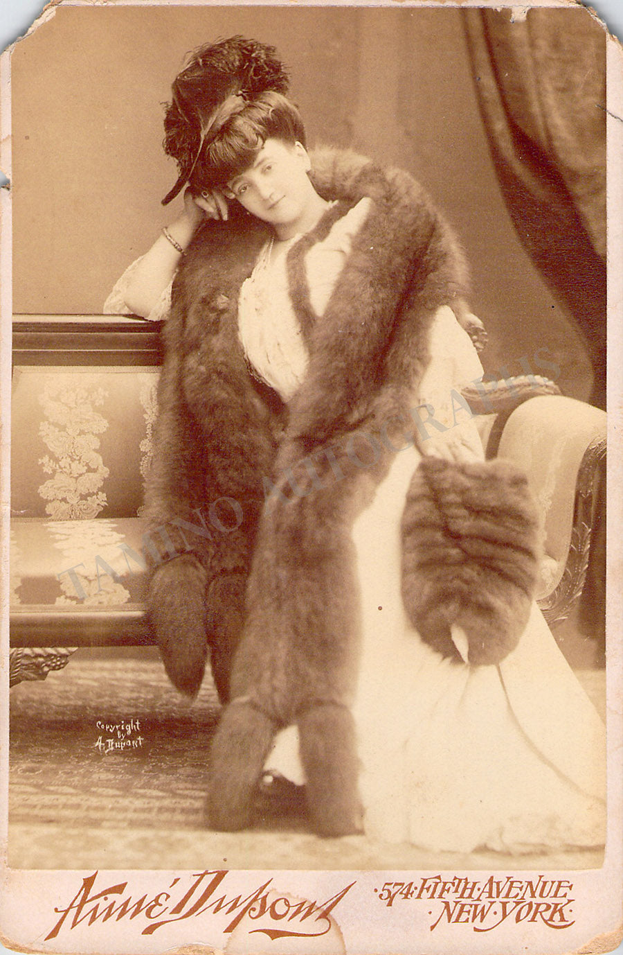 Unsigned cabinet photograph, shown as herself. Photo by Aime Dupont, New York. Size is 4.25 x 6.5 inches, sharp cuts/missing paper at top left and right and bottom right borders as well as to the left of the photo, discount reflected in price.