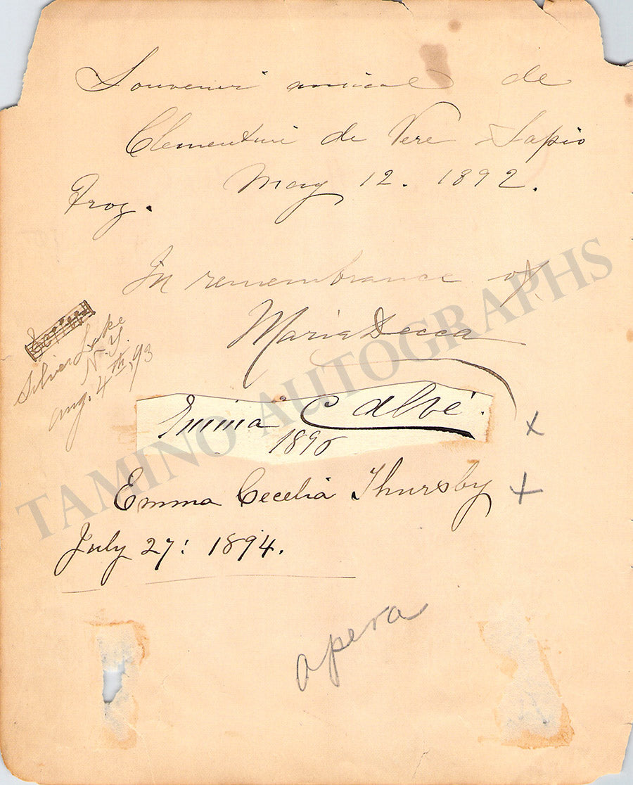 A fine album page with the signatures on both sides by very important opera singers of the late XIX century including Emma Calve (attached clip dated 1896), Emma Thursby, George Henschel, Marie Decca, Clementine De Vere-Sapie, and also the Dutch cellist Joseph Hollman and American violinist Nettie Carpenter, plus some other unidentified signatures.