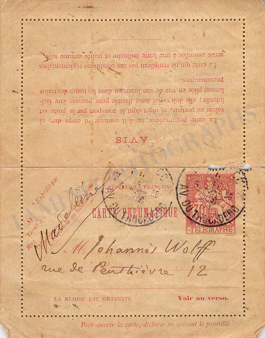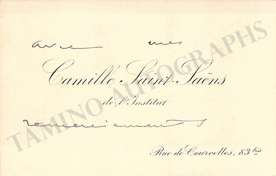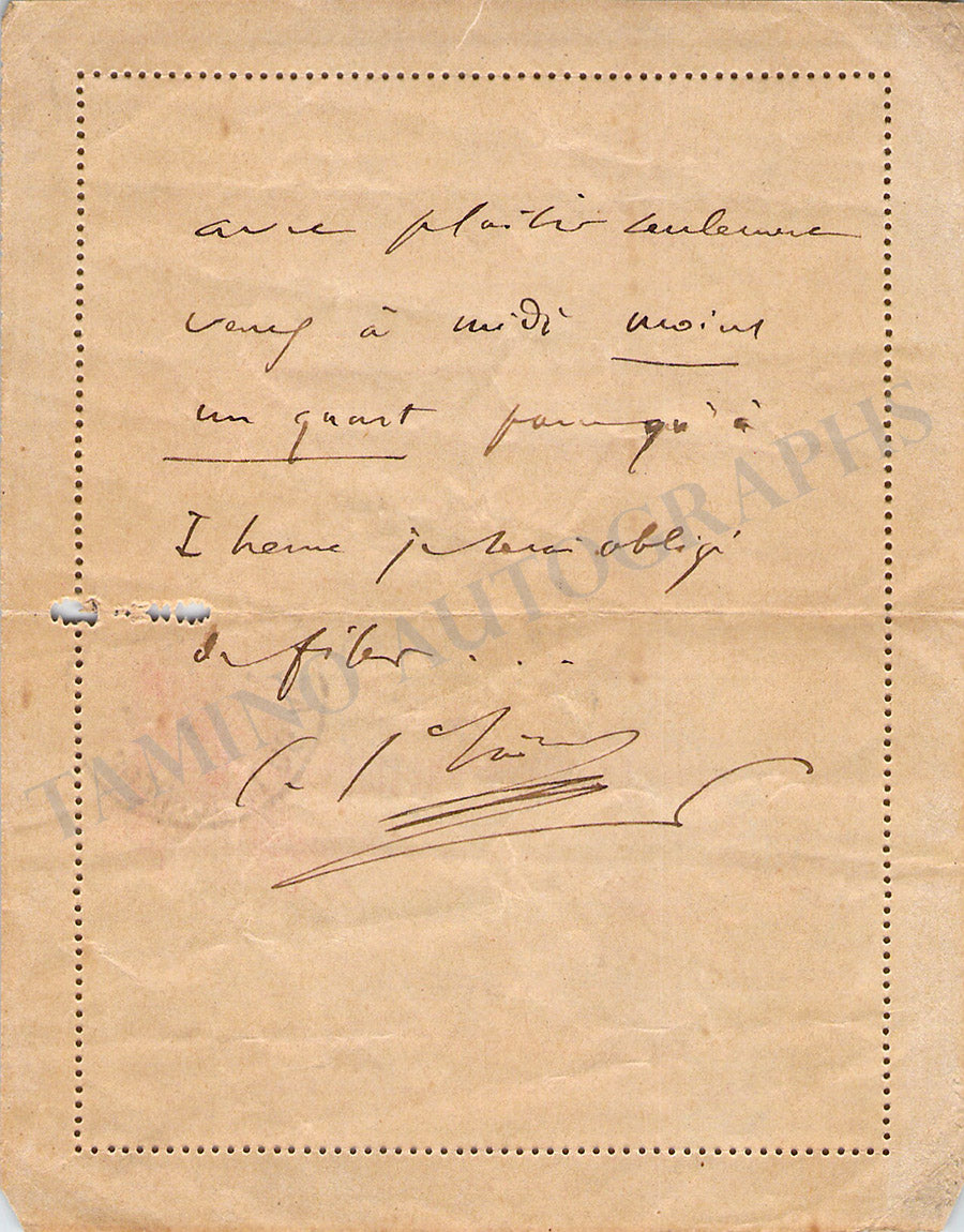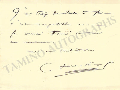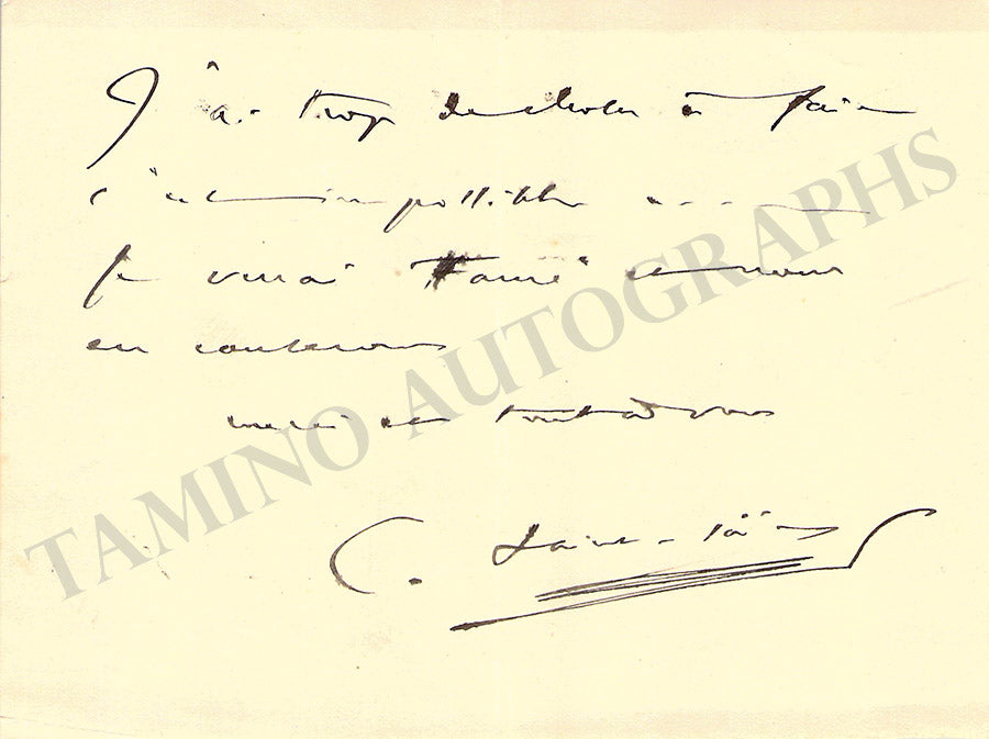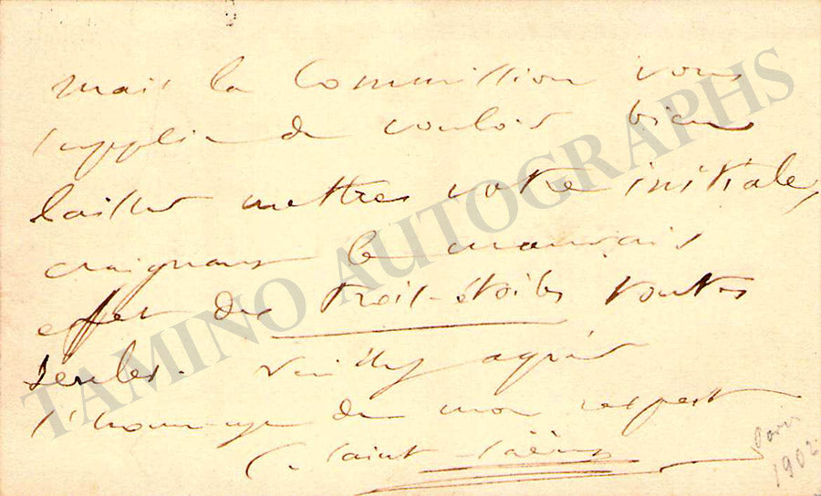 Autograph note in French on his personal card signed by him, dated 1902 (according to pencil markings). Size is 3.9 x 2.3 inches, evident mat burn signs, in very good condition.