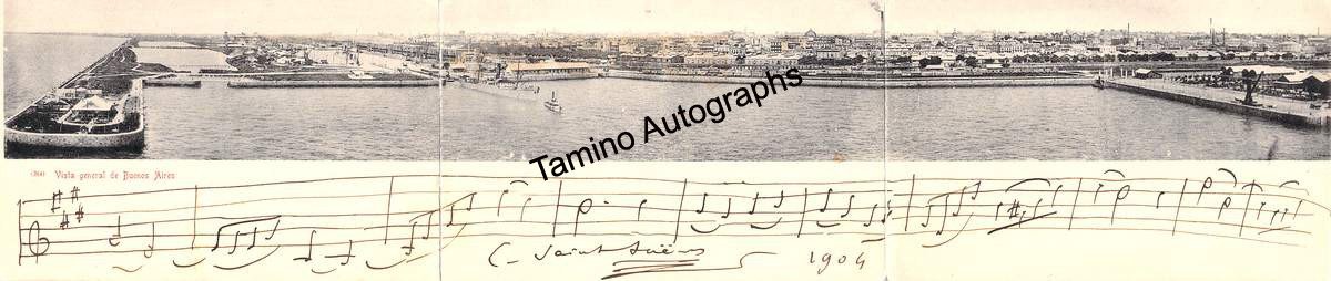 Unusually large autograph music quote, signed by him and dated in 1904, in a 3-part folded photo postcard of Buenos Aires, Argentina - a place he visited for the first time ever on a concert tour in July 1904, returning later in 1916 for the second and last time.