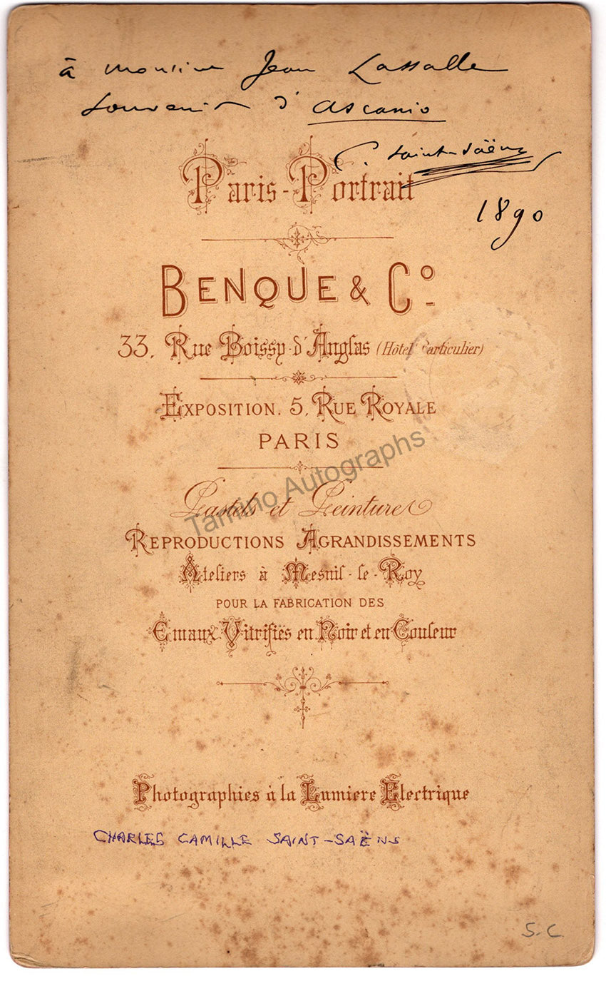 Fantastic imperial-sized cabinet photograph of the composer by Benque & Co, Paris, signed by Saint-Saëns on its verso and inscribed to the French baritone Jean Lasalle probably on the occasion of the world premiere of the composer's opera "Ascanio" on March 21st, 1890, where Lasalle created the role of Benvenuto Cellini.