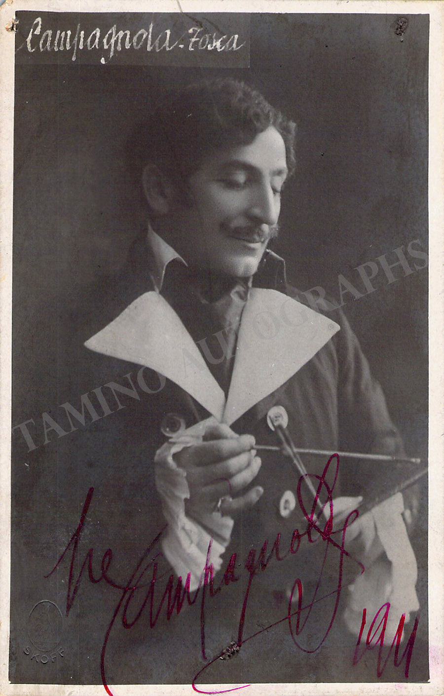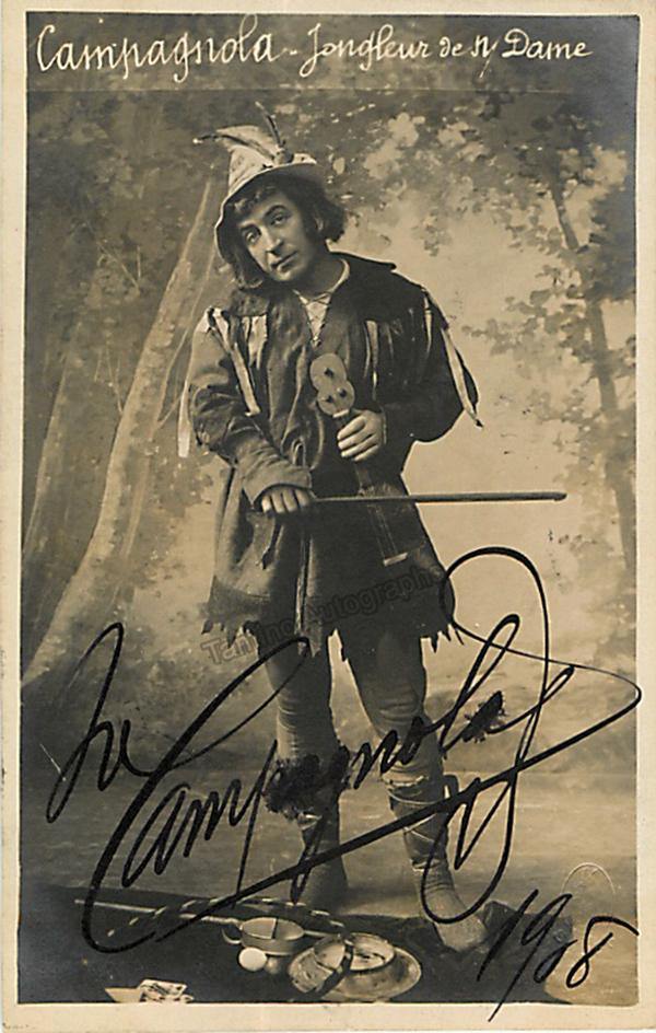 Signed photo postcard, shown in role in Massenet's Le Jongleur de Notre Dame, dated in 1912. Blind stamped by photographer S. Koff. Size is 3.5 x 5.5 inches, in excellent condition.