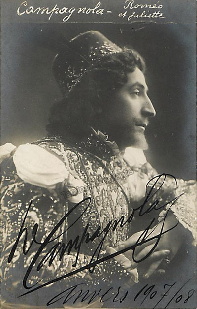 Signed photo postcard, shown as Romeo in Romero and Juliet, dated in 1907/1908. Size is 3.5 x 5.5 inches.