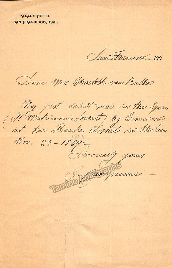 Autograph note signed, written on stationary of the Palace Hotel, San Francisco. Written in English, size is 5.5 x 8.5 inches, tear at the bottom and top, repaired in the back, in good condition.
