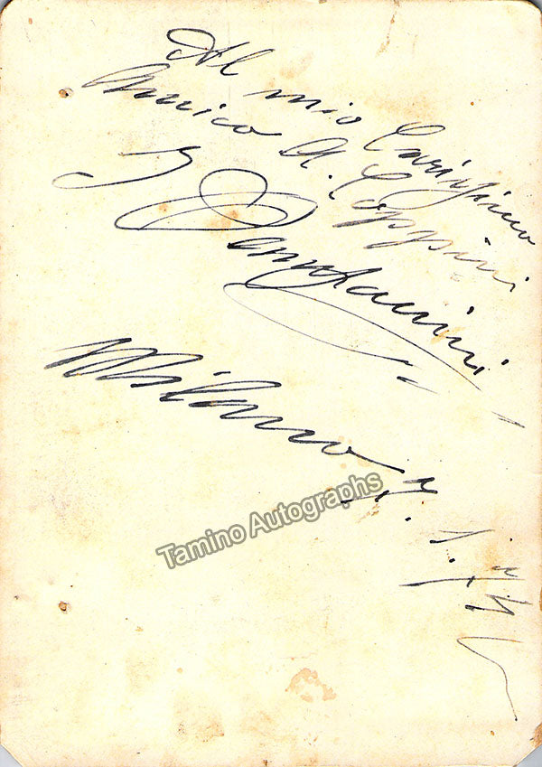 Signed cabinet photograph, shown as himself, inscribed and dated in Milan in 1874. Size is 4.25 x 6.5 inches, lower and left corners trimmed, 2 pinholes, and spotted rust stains, otherwise in good condition.