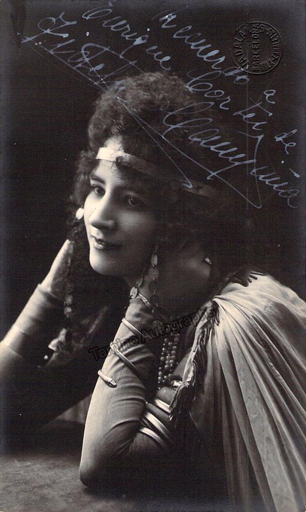 Spanish soprano (1894-1983), signed photo postcard, shown in role. Inscribed with sentiment. Blind stamped by photographer Vadalak, Barcelona. Size is 3 x 5.25 inches with some silvering on edges of photo but otherwise in good condition.  Rare!