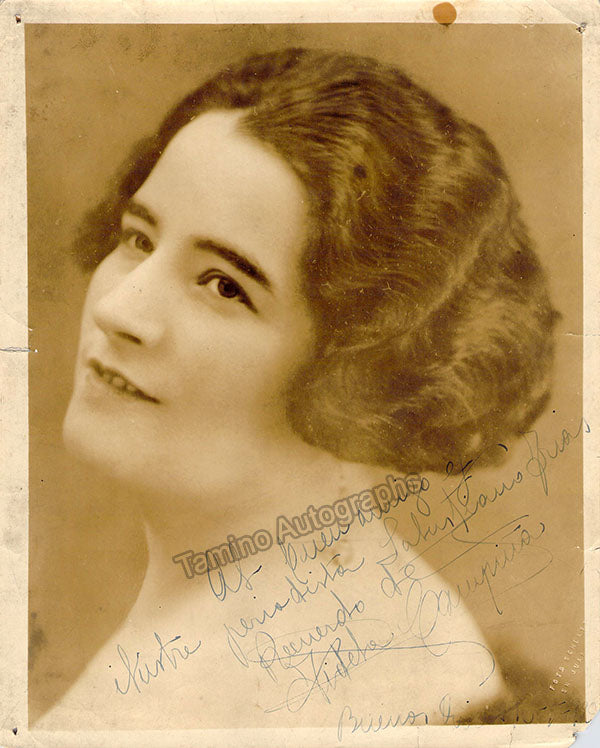 Celebrated Spanish soprano (1894-1983), signed photograph, shown as herself, inscribed in Buenos Aires. Blind stamped on front by photographer Schlatt.  Size is 8 x 10 inches, several tears, bullet holes and creases not affecting image and signature, priced accordingly.