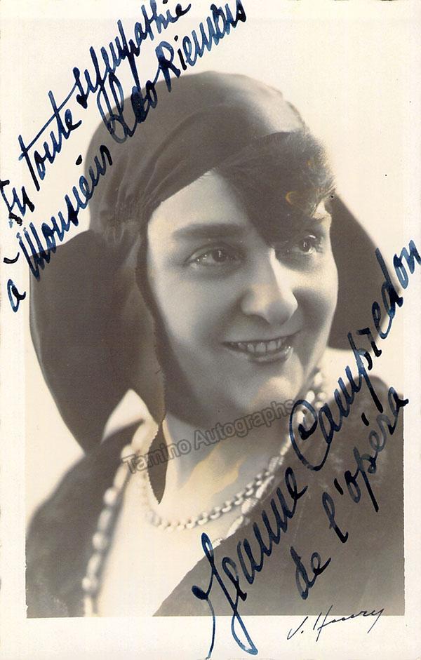 French Algerian soprano (1884-?) a featured artist at the Paris Opera until 1934, signed photo postcard, shown in role. Inscribed to Leo Riemens. Bold and clear signature. Size is 3.5 x 5.5 inches with bending on corners but otherwise very good condition.