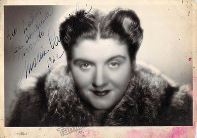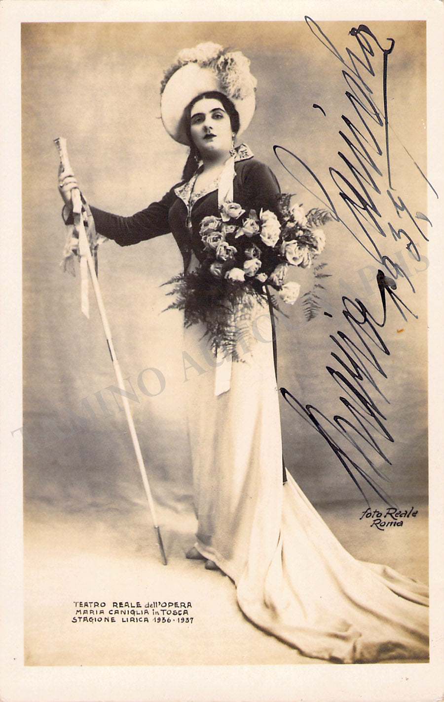 Signed photograph, shown in the title role of Giordano's Fedora. Photo by Foto Reale photographers, Rome. Size is 4.75 x 6.75 inches, some creases and bends, but in generally good condition.