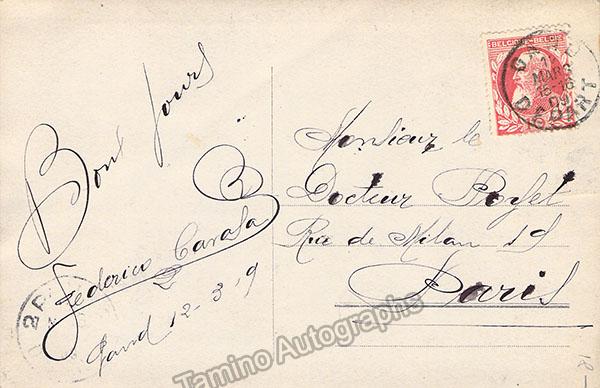 Spanish tenor (1888-?), signed photo postcard, shown in role, dated in 1919. Signature on verso. Size is 3.5 x 5.25 inches, rare vintage photo in excellent condition.