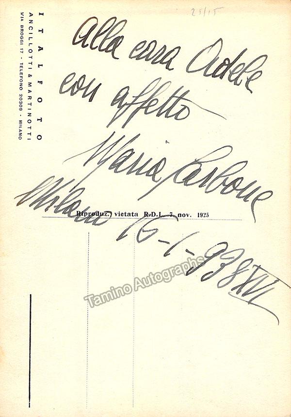 Signed photo, shown as herself, inscribed. Photo by M. Camuzzi, Milan. Size is 4 x 5.75 inches, in excellent condition.