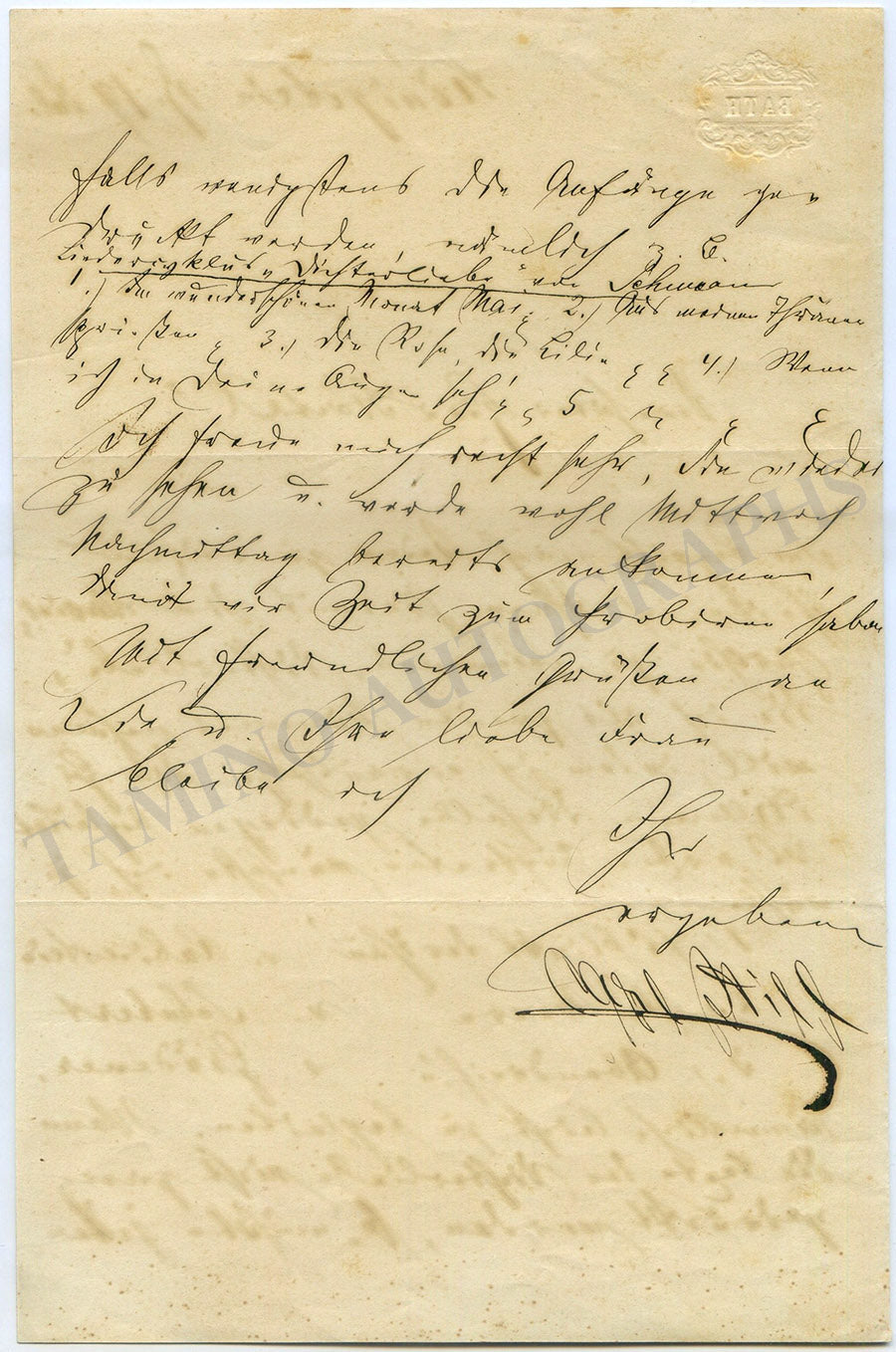 Autograph letter in German (untranslated) signed by him, no date, where he addresses the music publisher Härtel, concerning some music scores by Rubinstein, Schubert, and Graedener he needs for upcoming concerts.