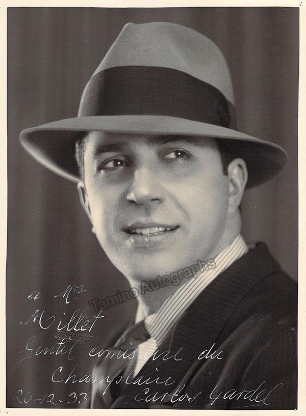 French-born Uruguayan-Argentinian singer (1890-1935) and also composer, owner of a beautiful tenor voice, considered the most famous tango singer in history, dying tragically in a plane crash aged 45, when he was at the peak of his fame.  Beautiful signed photograph, inscribed with a short sentiment in French, dated in 1933.  Blind stamped on the front and ink-stamped on verso by Foto Silva, Montevideo, Uruguay.  Size is 6.75 x 9.25 inches, tiny pinholes over the upper-right and lower-left corners, otherwise in excellent condition.
