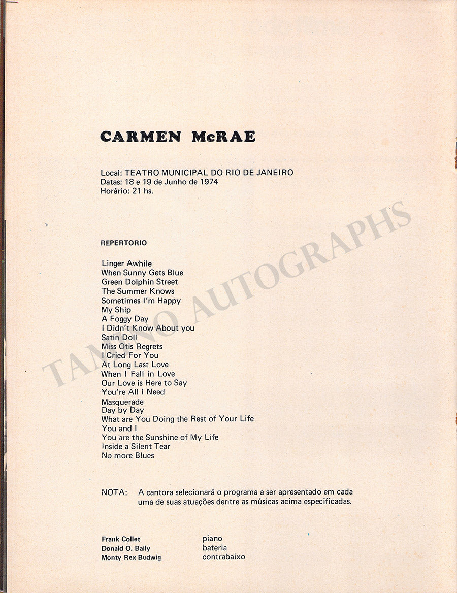 ALSO INCLUDED is a program for a performance of the singer in Rio de Janeiro, Brazil, on June 1947, signed on the front cover.  Size is 8.25 x 10.8 inches, full program with all pages and covers, in excellent condition.