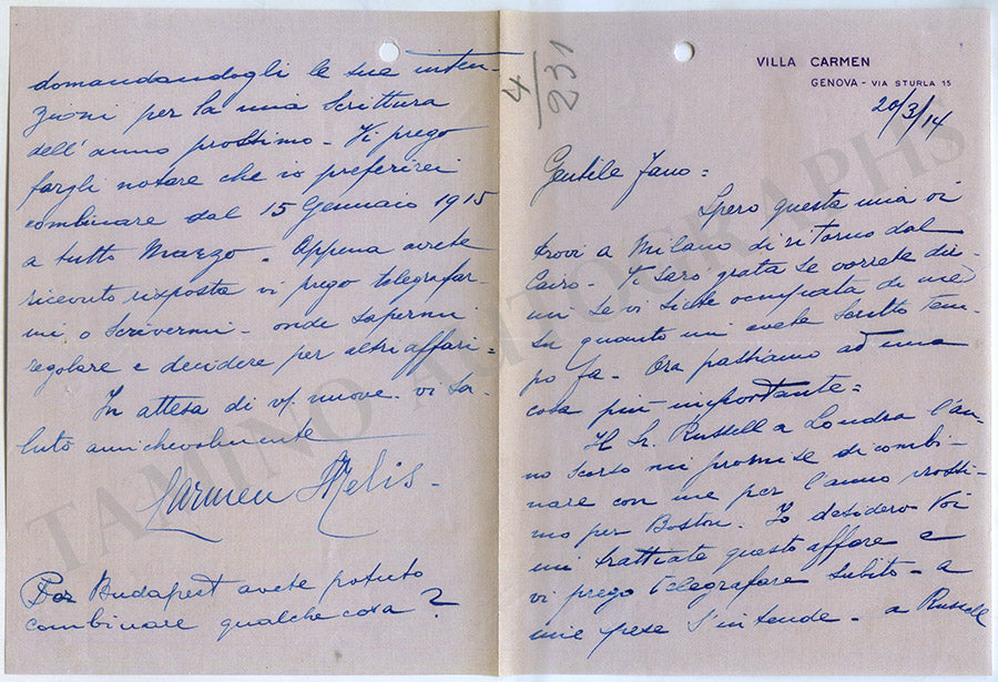 Autograph letter in Italian (untranslated) signed by her, dated March 20, 1914, to the impresario Fano: