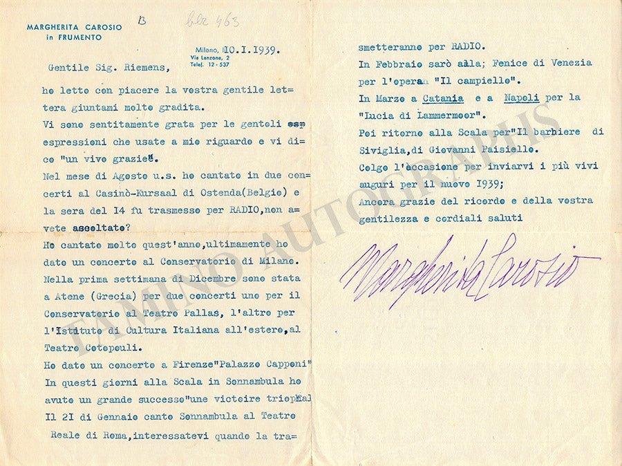 Typed letter signed, written in Milan, dated in 1939. 2 pages on both sides of a 8.25 x 11 inch document, written in Italian, sold untranslated. Small crease on the bottom left and right, otherwise in very good condition.
