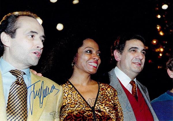 Spanish tenor Jose Carreras (b.1946), and Spanish tenor, director, and conductor, Placido Domingo (b.1941), double signed photograph, shown as themselves with the famous American pop singer Diana Ross. Size is 5 x 7 inches, in excellent condition.