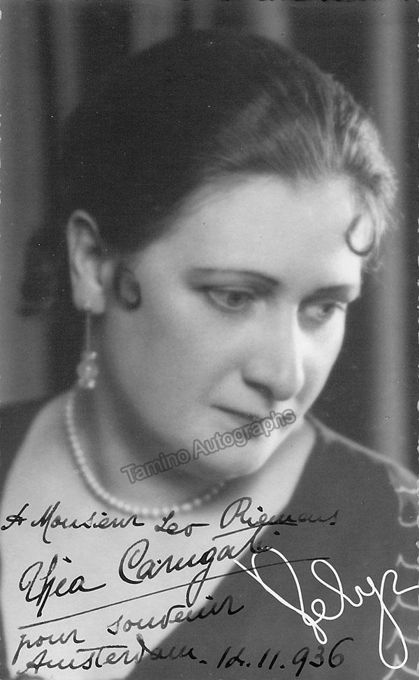 Italian soprano (1893-1961), signed photo postcard, shown in role. Inscribed and dated 1936. Stamped on verso by photographer Pelys, Lisbon. Bold and clear text and signature. Size is 3.25 x 5.25 inches, in excellent condition.