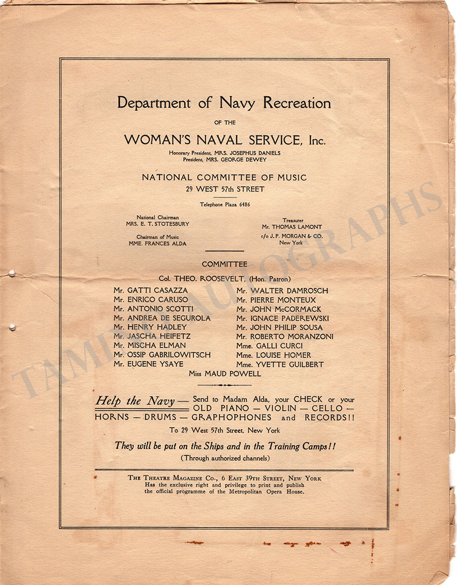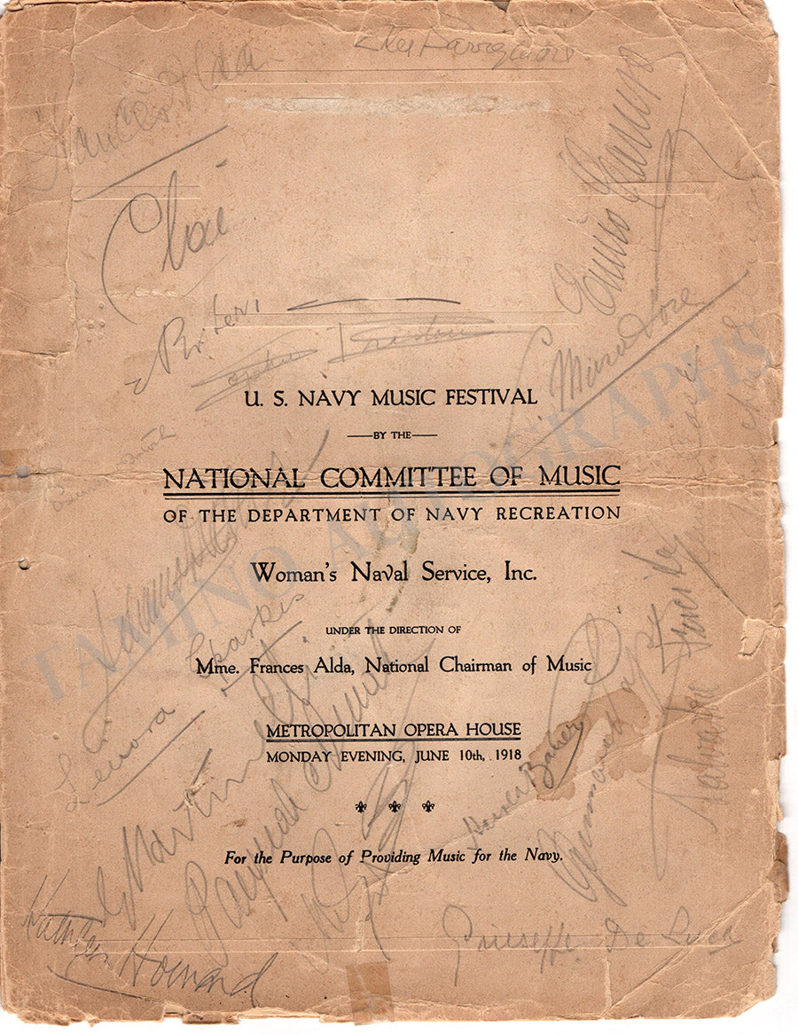 Original vintage program for a concert produced by the US Navy Festival at The Metropolitan Opera House, on June 10th, 1918, signed by different opera stars such as Enrico Caruso, Frances Alda, Giuseppe De Luca, Pasqual D'Amato, Giovanni Martinelli, Lucien Muratore, Salvatore Fusita, Anna Case, violinist Mischa Elman, and other artists, on the cover.