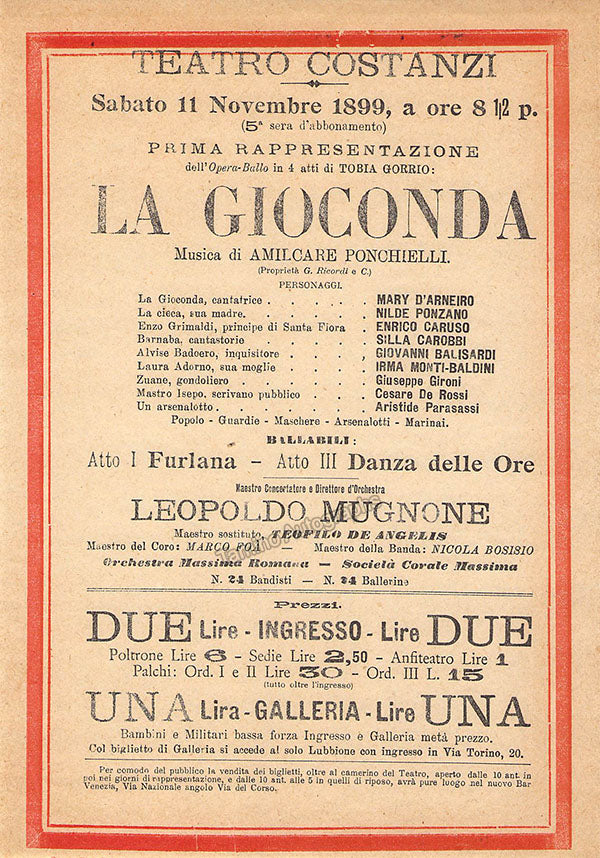 Very attractive playbill from Teatro Costanzi of the Teatro dell'Opera di Roma (Rome Opera House) for a performance of Ponchielli´s opera "La Gioconda" on November 11th, 1899 featuring the super star Italian tenor and other leading performers of the era. This is a beautifully preserved 6.5 x 9.75 vintage item, in excellent condition.
