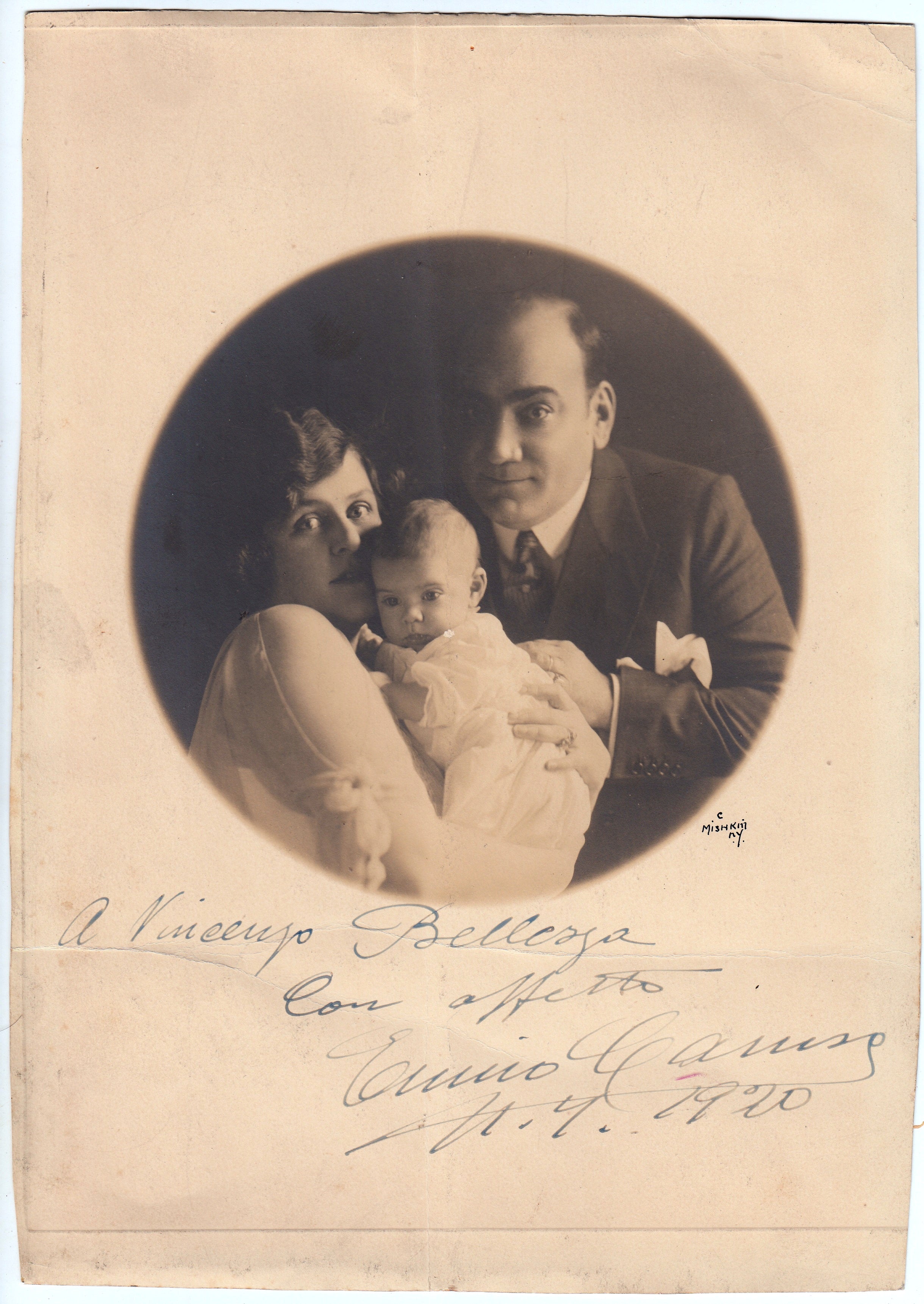 Beautiful half-tone photograph of the super star Italian tenor (1873-1921), signed and inscribed by him, shown with his wife Dorothy and daughter Gloria, inscribed to the prominent Italian conductor Vincenzo Bellezza, dated in New York in 1920.  An original photograph with a printed signature on the front by photographer C. Mishkin, New York.