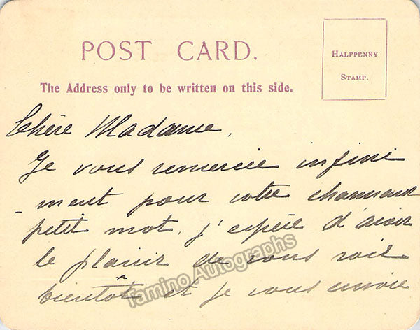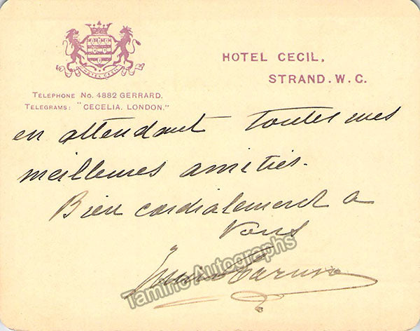 Handwritten signed postcard signed by the star Italian tenor on both sides of the postcard, written in French and sold untranslated.  Postcard was from the Hotel Cecil, London, size is 3.5 x 4.5 inches, in excellent condition.