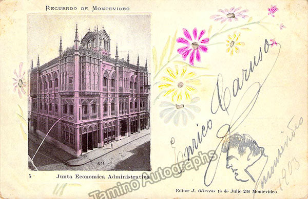 Italian super star tenor (1873-1921) who was also an amateur caricaturist. Self-caricature drawn on the bottom right side of a signed postcard containing a photographic image of the Economic Ministry building in Montevideo, Uruguay, dated in Montevideo in 1903. His signature is just above his self-caricature. Sze is 3.5 x 5.5 inches, in very good condition.