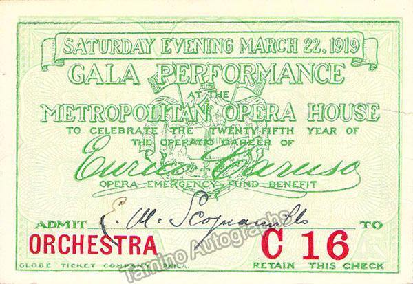 Caruso, Enrico - Unsigned Photo + Ticket Stub for Gala celebrating 25th Year Anniversary of his career 1919
