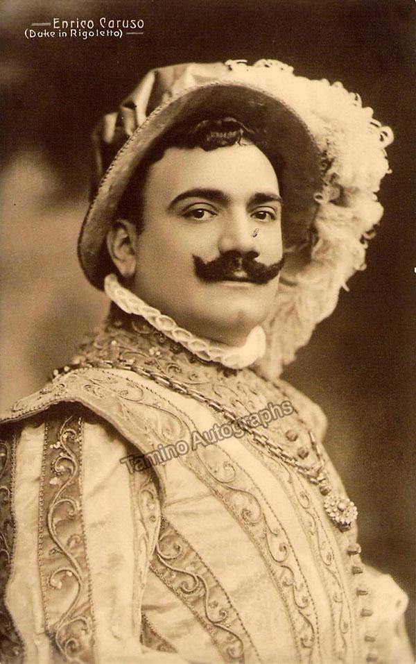 Super star Italian tenor (1873-1921), unsigned photo, shown as the Duke in Verdi's Rigoletto, size is 3.5 x 5.5 inches, slight rust on verso, otherwise in excellent condition. Also included: 1 ticket stub for a Metropolitan Opera gala, of March 22, 2019, celebrating the twenty-fifth anniversary of the beginning of his operatic career.  Size is 2.5 x 4 inches, very rare vintage item in excellent condition!