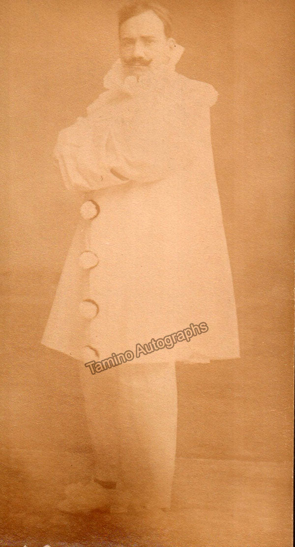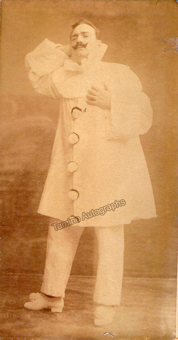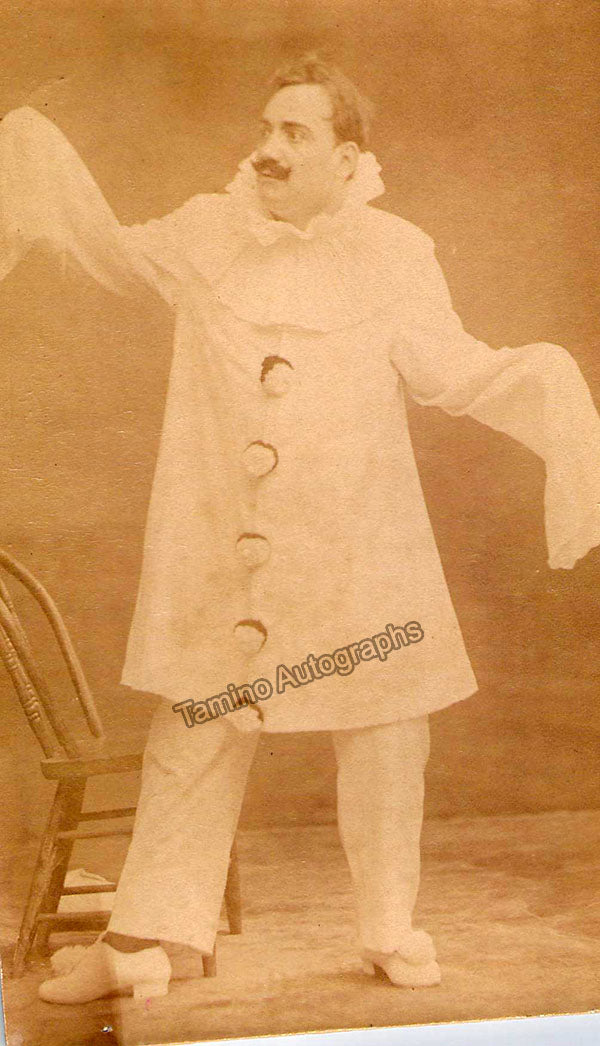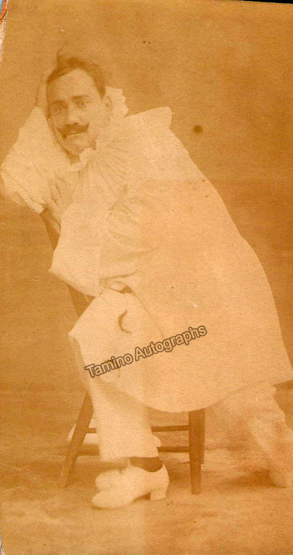 Unsigned cabinet-style photo, shown as Canio in Leoncavallo's I Pagliacci. Size is 3.25 x 5.75 inches, very slight paper loss on the right and mounting traces on verso, otherwise in very good condition.