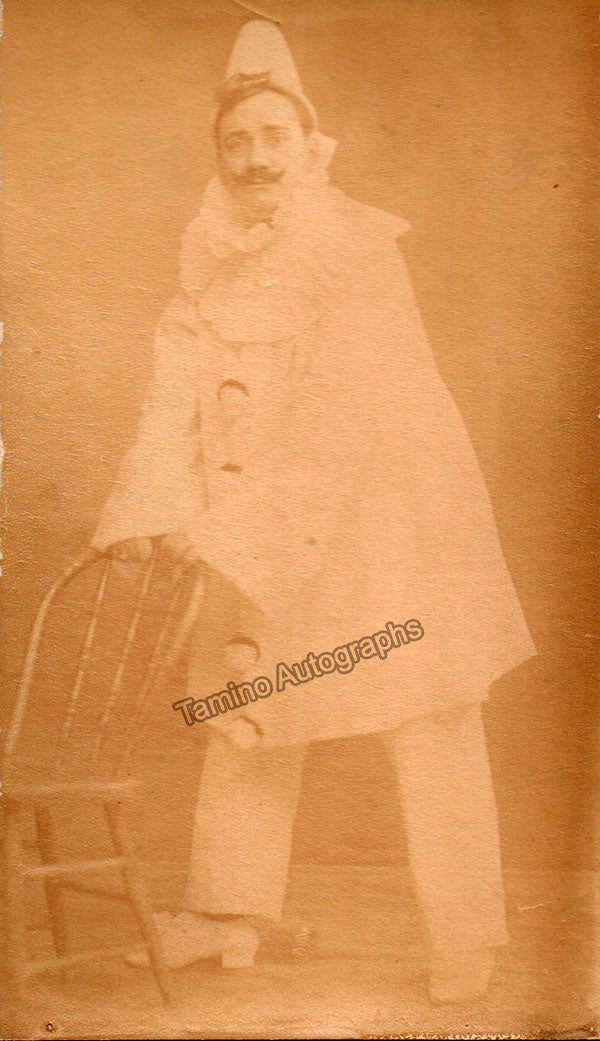 Unsigned cabinet-style photo, shown as Canio in Leoncavallo's I Pagliacci. Size is 3.5 x 5.75 inches, mounting traces on verso, otherwise in very good condition.