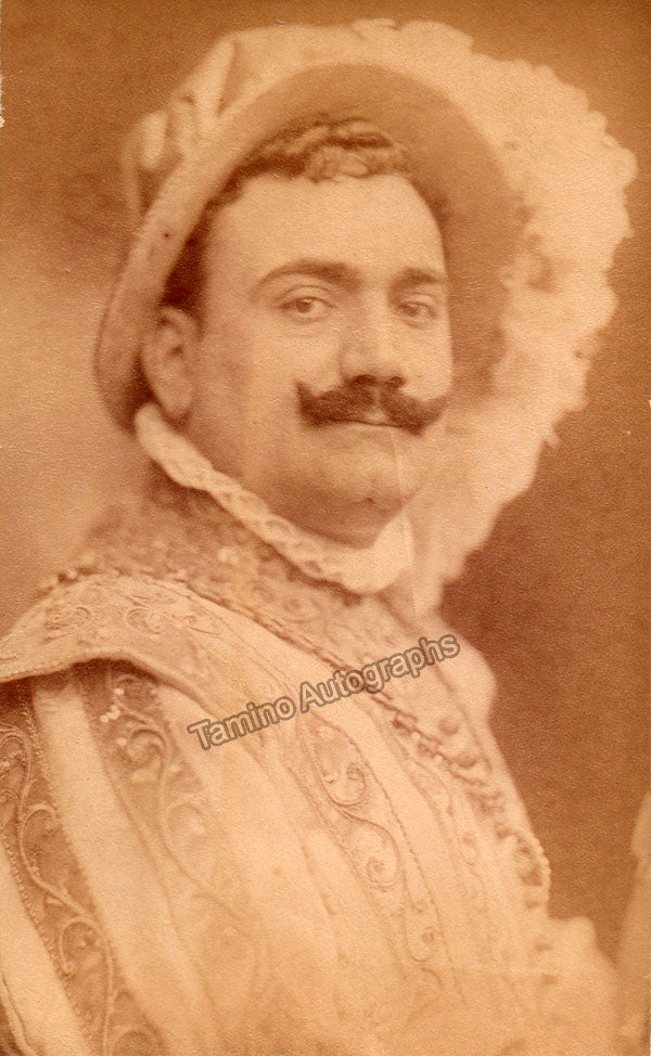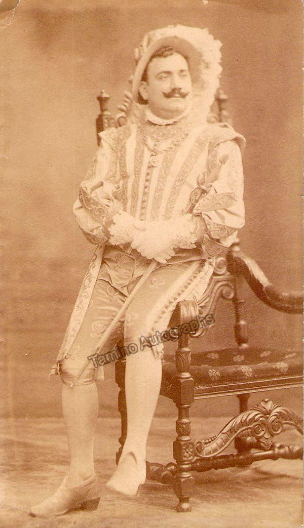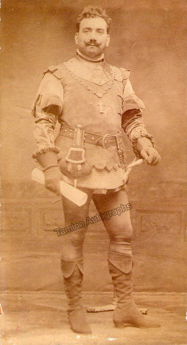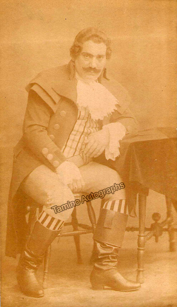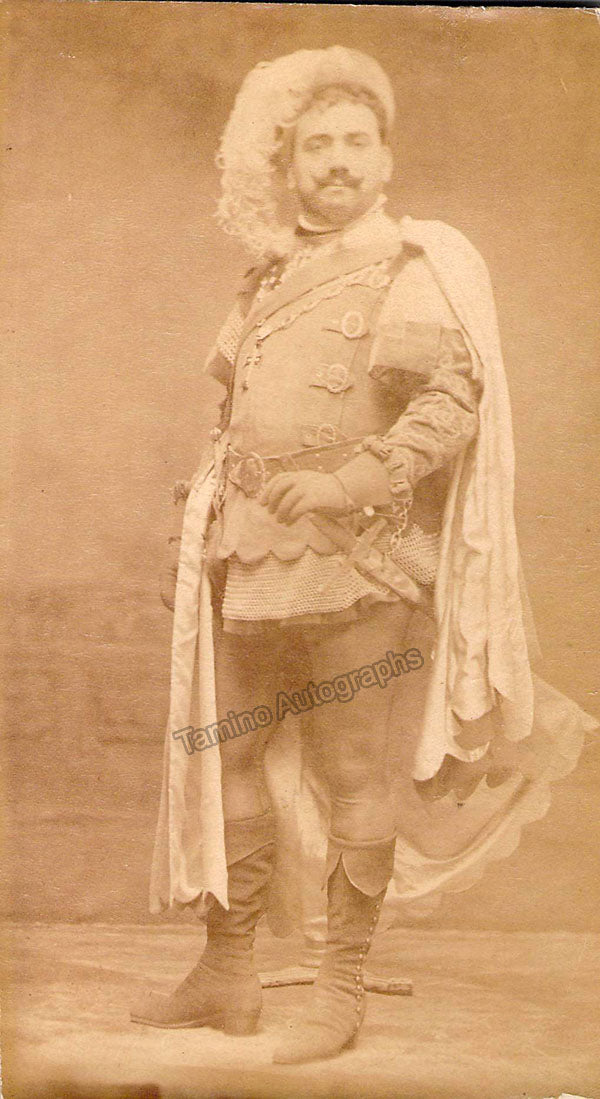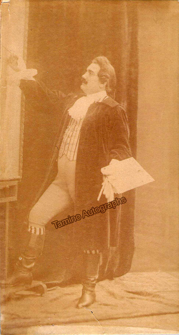 Unsigned cabinet-style photo, shown as Vasco da Gama in Meyerbeer's L'Africaine. Size is 3.5 x 6.25 inches, slight paper loss on top and bottom right and mounting traces on verso, otherwise in very good condition.