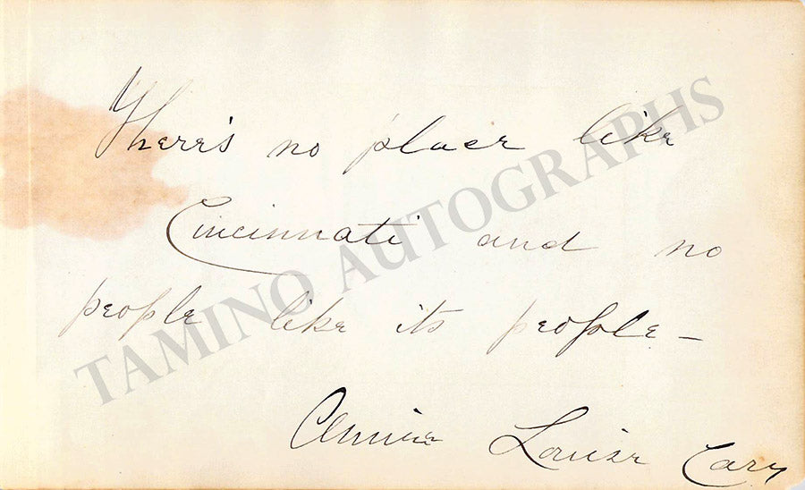American contralto (1841-1921), one of the most popular singers of her era. Signed page on 3.75 x 6.25 inch carbon paper, small smudge on the left, not affecting the handwriting and signature. Also included: unsigned photo postcard, shown as herself, a 2.25 x 3.75 inch photo mounted on soft cardboard, total item size is 3.75 x 6.25 inches, in very good condition. Not sold separately.