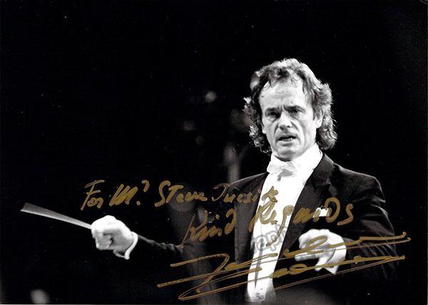 French conductor (b.1935) and former principal conductor of the Orchestre National de Lille.  Beautiful black and white photograph shown in performance, signed and inscribed by him with a short sentiment.  Size is 7 x 5 inches, in excellent condition.