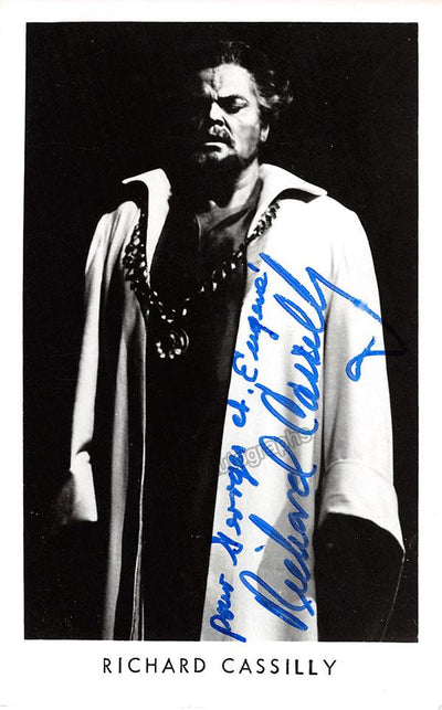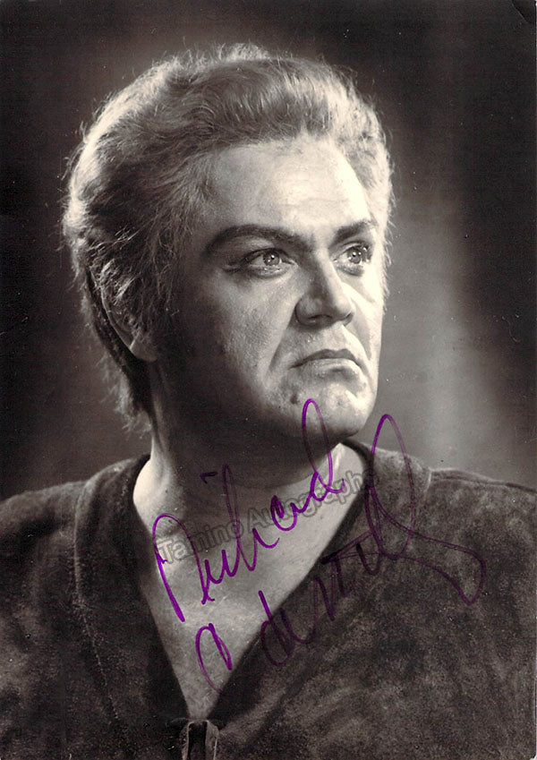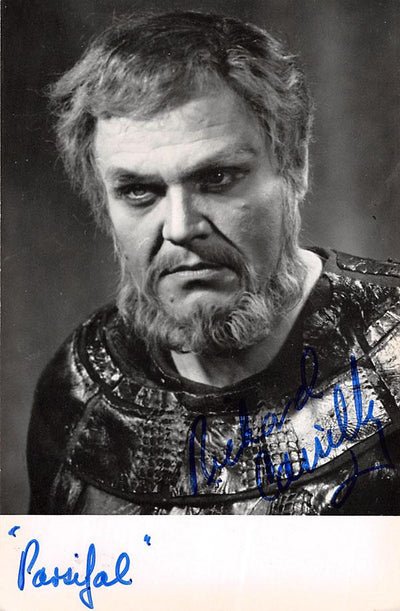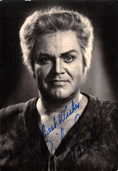 Beautiful black-and-white photograph signed and inscribed by him with a short sentiment in French in 1965; shown as Lohengrin in Wagner's opera. Size is 5 x 7.1 inches, tape residues over the top (back), ink writing on verso, ink-stamped on verso by Georges Farret (Marseille), in excellent condition.