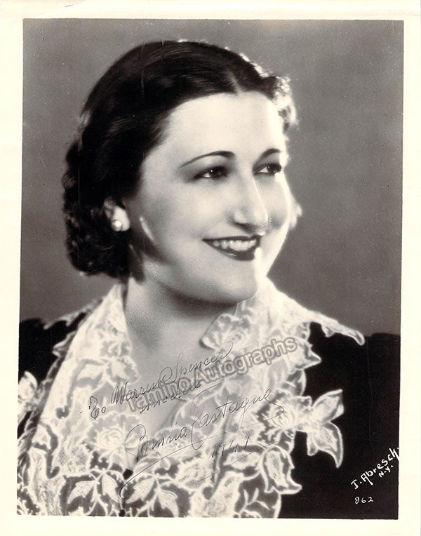 Signed photograph, shown most likely as herself, inscribed and dated in 1941. Printed signature on front of photographer James Abresch, New York. Size is 8 x 10 inches, small creases at very top, otherwise in very good condition.